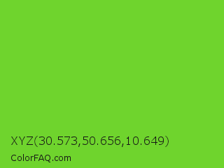 XYZ 30.573,50.656,10.649 Color is a normal green color and the nearest color is Lima #76bd17. Hex code #6fd42d and RGB value is rgb(111,212,45). In RGB color space, this color is composed of 44% red, 83% green, 18% blue, In CMYK color space, this color is composed of 48% cyan, 0% magenta, 79% yellow , 17% black , In HSL color space, this color has a hue angle of 96° , 66% saturation and 50% lightness.