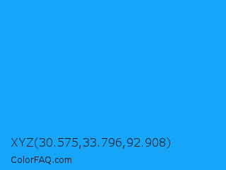 XYZ 30.575,33.796,92.908 Color is a normal blue color and the nearest color is Button Blue #24a0ed. Hex code #16a5f7 and RGB value is rgb(22,165,247). In RGB color space, this color is composed of 9% red, 65% green, 97% blue, In CMYK color space, this color is composed of 91% cyan, 33% magenta, 0% yellow , 3% black , In HSL color space, this color has a hue angle of 202° , 93% saturation and 53% lightness.