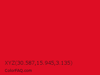 XYZ 30.587,15.945,3.135 Color is a normal red color and the nearest color is Medium Candy Apple Red #e2062c. Hex code #de0d24 and RGB value is rgb(222,13,36). In RGB color space, this color is composed of 87% red, 5% green, 14% blue, In CMYK color space, this color is composed of 0% cyan, 94% magenta, 84% yellow , 13% black , In HSL color space, this color has a hue angle of 353° , 89% saturation and 46% lightness.
