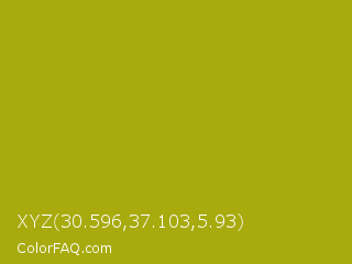 XYZ 30.596,37.103,5.93 Color is a normal yellow color and the nearest color is Sahara #b7a214. Hex code #a8aa0d and RGB value is rgb(168,170,13). In RGB color space, this color is composed of 66% red, 67% green, 5% blue, In CMYK color space, this color is composed of 1% cyan, 0% magenta, 92% yellow , 33% black , In HSL color space, this color has a hue angle of 61° , 86% saturation and 36% lightness.