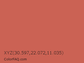 XYZ 30.597,22.072,11.035 Color is a normal red color and the nearest color is Chestnut Rose #cd5c5c. Hex code #cb6254 and RGB value is rgb(203,98,84). In RGB color space, this color is composed of 80% red, 38% green, 33% blue, In CMYK color space, this color is composed of 0% cyan, 52% magenta, 59% yellow , 20% black , In HSL color space, this color has a hue angle of 7° , 53% saturation and 56% lightness.