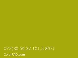 XYZ 30.59,37.101,5.897 Color is a normal yellow color and the nearest color is Sahara #b7a214. Hex code #a8aa0c and RGB value is rgb(168,170,12). In RGB color space, this color is composed of 66% red, 67% green, 5% blue, In CMYK color space, this color is composed of 1% cyan, 0% magenta, 93% yellow , 33% black , In HSL color space, this color has a hue angle of 61° , 87% saturation and 36% lightness.