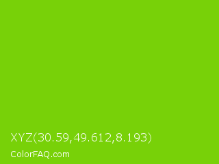 XYZ 30.59,49.612,8.193 Color is a normal green color and the nearest color is Alien Armpit #84de02. Hex code #78d108 and RGB value is rgb(120,209,8). In RGB color space, this color is composed of 47% red, 82% green, 3% blue, In CMYK color space, this color is composed of 43% cyan, 0% magenta, 96% yellow , 18% black , In HSL color space, this color has a hue angle of 87° , 93% saturation and 43% lightness.