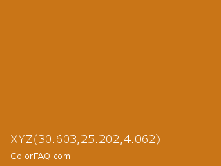 XYZ 30.603,25.202,4.062 Color is a normal orange color and the nearest color is Ochre #cc7722. Hex code #c97517 and RGB value is rgb(201,117,23). In RGB color space, this color is composed of 79% red, 46% green, 9% blue, In CMYK color space, this color is composed of 0% cyan, 42% magenta, 89% yellow , 21% black , In HSL color space, this color has a hue angle of 32° , 79% saturation and 44% lightness.