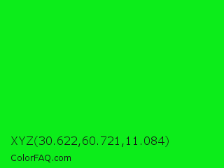 XYZ 30.622,60.721,11.084 Color is a normal green color and the nearest color is Green #00ff00. Hex code #0ced1a and RGB value is rgb(12,237,26). In RGB color space, this color is composed of 5% red, 93% green, 10% blue, In CMYK color space, this color is composed of 95% cyan, 0% magenta, 89% yellow , 7% black , In HSL color space, this color has a hue angle of 124° , 90% saturation and 49% lightness.