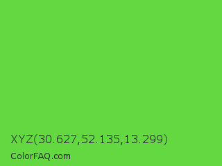 XYZ 30.627,52.135,13.299 Color is a normal green color and the nearest color is Green RYB #66b032. Hex code #63d840 and RGB value is rgb(99,216,64). In RGB color space, this color is composed of 39% red, 85% green, 25% blue, In CMYK color space, this color is composed of 54% cyan, 0% magenta, 70% yellow , 15% black , In HSL color space, this color has a hue angle of 106° , 66% saturation and 55% lightness.
