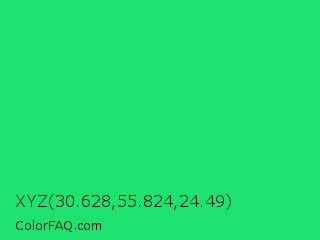 XYZ 30.628,55.824,24.49 Color is a normal green color and the nearest color is UFO Green #3cd070. Hex code #1de270 and RGB value is rgb(29,226,112). In RGB color space, this color is composed of 11% red, 89% green, 44% blue, In CMYK color space, this color is composed of 87% cyan, 0% magenta, 50% yellow , 11% black , In HSL color space, this color has a hue angle of 145° , 77% saturation and 50% lightness.