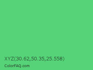 XYZ 30.62,50.35,25.558 Color is a normal green color and the nearest color is Emerald #50c878. Hex code #55d477 and RGB value is rgb(85,212,119). In RGB color space, this color is composed of 33% red, 83% green, 47% blue, In CMYK color space, this color is composed of 60% cyan, 0% magenta, 44% yellow , 17% black , In HSL color space, this color has a hue angle of 136° , 60% saturation and 58% lightness.