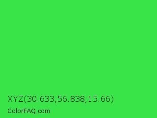 XYZ 30.633,56.838,15.66 Color is a normal green color and the nearest color is Lime Green #32cd32. Hex code #39e449 and RGB value is rgb(57,228,73). In RGB color space, this color is composed of 22% red, 89% green, 29% blue, In CMYK color space, this color is composed of 75% cyan, 0% magenta, 68% yellow , 11% black , In HSL color space, this color has a hue angle of 126° , 76% saturation and 56% lightness.