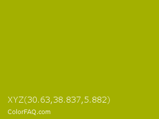 XYZ 30.63,38.837,5.882 Color is a normal yellow color and the nearest color is Pistachio Green #9dc209. Hex code #a3b000 and RGB value is rgb(163,176,0). In RGB color space, this color is composed of 64% red, 69% green, 0% blue, In CMYK color space, this color is composed of 7% cyan, 0% magenta, 100% yellow , 31% black , In HSL color space, this color has a hue angle of 64° , 100% saturation and 35% lightness.