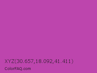 XYZ 30.657,18.092,41.411 Color is a normal magenta color and the nearest color is Byzantine #bd33a4. Hex code #bd45ad and RGB value is rgb(189,69,173). In RGB color space, this color is composed of 74% red, 27% green, 68% blue, In CMYK color space, this color is composed of 0% cyan, 63% magenta, 8% yellow , 26% black , In HSL color space, this color has a hue angle of 308° , 48% saturation and 51% lightness.