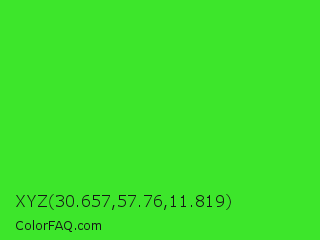 XYZ 30.657,57.76,11.819 Color is a normal green color and the nearest color is Lime Green #32cd32. Hex code #3de62b and RGB value is rgb(61,230,43). In RGB color space, this color is composed of 24% red, 90% green, 17% blue, In CMYK color space, this color is composed of 73% cyan, 0% magenta, 81% yellow , 10% black , In HSL color space, this color has a hue angle of 114° , 79% saturation and 54% lightness.