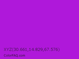 XYZ 30.661,14.829,67.576 Color is a normal purple color and the nearest color is Vivid Mulberry #b80ce3. Hex code #af18da and RGB value is rgb(175,24,218). In RGB color space, this color is composed of 69% red, 9% green, 85% blue, In CMYK color space, this color is composed of 20% cyan, 89% magenta, 0% yellow , 15% black , In HSL color space, this color has a hue angle of 287° , 80% saturation and 47% lightness.