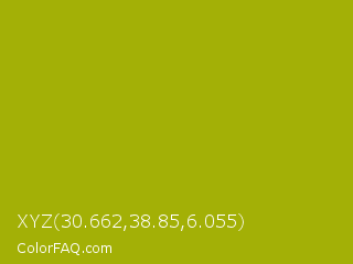 XYZ 30.662,38.85,6.055 Color is a normal yellow color and the nearest color is Pistachio Green #9dc209. Hex code #a3b006 and RGB value is rgb(163,176,6). In RGB color space, this color is composed of 64% red, 69% green, 2% blue, In CMYK color space, this color is composed of 7% cyan, 0% magenta, 97% yellow , 31% black , In HSL color space, this color has a hue angle of 65° , 93% saturation and 36% lightness.