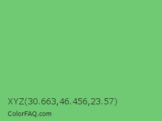 XYZ 30.663,46.456,23.57 Color is a light green color and the nearest color is Iguana Green #71bc78. Hex code #70c973 and RGB value is rgb(112,201,115). In RGB color space, this color is composed of 44% red, 79% green, 45% blue, In CMYK color space, this color is composed of 44% cyan, 0% magenta, 43% yellow , 21% black , In HSL color space, this color has a hue angle of 122° , 45% saturation and 61% lightness.
