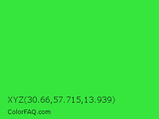 XYZ 30.66,57.715,13.939 Color is a normal green color and the nearest color is Lime Green #32cd32. Hex code #36e63d and RGB value is rgb(54,230,61). In RGB color space, this color is composed of 21% red, 90% green, 24% blue, In CMYK color space, this color is composed of 77% cyan, 0% magenta, 73% yellow , 10% black , In HSL color space, this color has a hue angle of 122° , 78% saturation and 56% lightness.