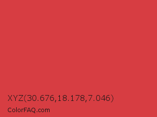 XYZ 30.676,18.178,7.046 Color is a normal red color and the nearest color is Jasper #d73b3e. Hex code #d73d42 and RGB value is rgb(215,61,66). In RGB color space, this color is composed of 84% red, 24% green, 26% blue, In CMYK color space, this color is composed of 0% cyan, 72% magenta, 69% yellow , 16% black , In HSL color space, this color has a hue angle of 358° , 66% saturation and 54% lightness.