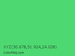 XYZ 30.678,51.924,24.028 Color is a normal green color and the nearest color is Emerald #50c878. Hex code #4ed871 and RGB value is rgb(78,216,113). In RGB color space, this color is composed of 31% red, 85% green, 44% blue, In CMYK color space, this color is composed of 64% cyan, 0% magenta, 48% yellow , 15% black , In HSL color space, this color has a hue angle of 135° , 64% saturation and 58% lightness.