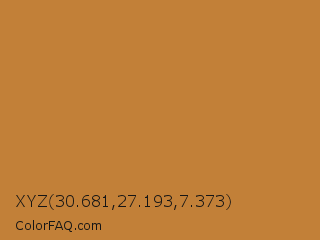XYZ 30.681,27.193,7.373 Color is a normal orange color and the nearest color is Bronze #cd7f32. Hex code #c28038 and RGB value is rgb(194,128,56). In RGB color space, this color is composed of 76% red, 50% green, 22% blue, In CMYK color space, this color is composed of 0% cyan, 34% magenta, 71% yellow , 24% black , In HSL color space, this color has a hue angle of 31° , 55% saturation and 49% lightness.