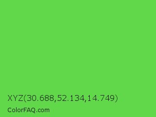XYZ 30.688,52.134,14.749 Color is a normal green color and the nearest color is Mantis #74c365. Hex code #61d849 and RGB value is rgb(97,216,73). In RGB color space, this color is composed of 38% red, 85% green, 29% blue, In CMYK color space, this color is composed of 55% cyan, 0% magenta, 66% yellow , 15% black , In HSL color space, this color has a hue angle of 110° , 65% saturation and 57% lightness.