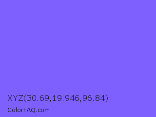 XYZ 30.69,19.946,96.84 Color is a light indigo color and the nearest color is Medium Slate Blue #7b68ee. Hex code #7d60ff and RGB value is rgb(125,96,255). In RGB color space, this color is composed of 49% red, 38% green, 100% blue, In CMYK color space, this color is composed of 51% cyan, 62% magenta, 0% yellow , 0% black , In HSL color space, this color has a hue angle of 251° , 100% saturation and 69% lightness.