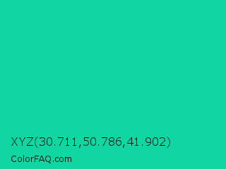 XYZ 30.711,50.786,41.902 Color is a normal cyan color and the nearest color is Caribbean Green #00cc99. Hex code #11d6a1 and RGB value is rgb(17,214,161). In RGB color space, this color is composed of 7% red, 84% green, 63% blue, In CMYK color space, this color is composed of 92% cyan, 0% magenta, 25% yellow , 16% black , In HSL color space, this color has a hue angle of 164° , 85% saturation and 45% lightness.