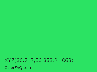XYZ 30.717,56.353,21.063 Color is a normal green color and the nearest color is UFO Green #3cd070. Hex code #2be363 and RGB value is rgb(43,227,99). In RGB color space, this color is composed of 17% red, 89% green, 39% blue, In CMYK color space, this color is composed of 81% cyan, 0% magenta, 56% yellow , 11% black , In HSL color space, this color has a hue angle of 138° , 77% saturation and 53% lightness.