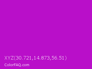 XYZ 30.721,14.873,56.51 Color is a normal magenta color and the nearest color is Deep Magenta #cc00cc. Hex code #b90fc9 and RGB value is rgb(185,15,201). In RGB color space, this color is composed of 73% red, 6% green, 79% blue, In CMYK color space, this color is composed of 8% cyan, 93% magenta, 0% yellow , 21% black , In HSL color space, this color has a hue angle of 295° , 86% saturation and 42% lightness.