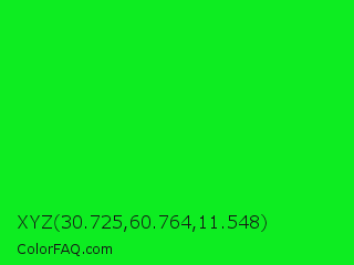 XYZ 30.725,60.764,11.548 Color is a normal green color and the nearest color is Green #00ff00. Hex code #0ded21 and RGB value is rgb(13,237,33). In RGB color space, this color is composed of 5% red, 93% green, 13% blue, In CMYK color space, this color is composed of 95% cyan, 0% magenta, 86% yellow , 7% black , In HSL color space, this color has a hue angle of 125° , 90% saturation and 49% lightness.