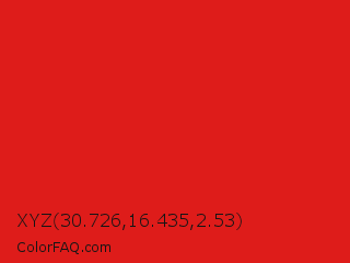 XYZ 30.726,16.435,2.53 Color is a normal red color and the nearest color is Maximum Red #d92121. Hex code #de1c1a and RGB value is rgb(222,28,26). In RGB color space, this color is composed of 87% red, 11% green, 10% blue, In CMYK color space, this color is composed of 0% cyan, 87% magenta, 88% yellow , 13% black , In HSL color space, this color has a hue angle of 1° , 79% saturation and 49% lightness.