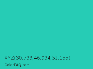 XYZ 30.733,46.934,51.155 Color is a normal cyan color and the nearest color is Java #1fc2c2. Hex code #26ccb5 and RGB value is rgb(38,204,181). In RGB color space, this color is composed of 15% red, 80% green, 71% blue, In CMYK color space, this color is composed of 81% cyan, 0% magenta, 11% yellow , 20% black , In HSL color space, this color has a hue angle of 172° , 69% saturation and 47% lightness.