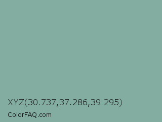 XYZ 30.737,37.286,39.295 Color is a normal green color and the nearest color is Acapulco #7cb0a1. Hex code #83ada1 and RGB value is rgb(131,173,161). In RGB color space, this color is composed of 51% red, 68% green, 63% blue, In CMYK color space, this color is composed of 24% cyan, 0% magenta, 7% yellow , 32% black , In HSL color space, this color has a hue angle of 163° , 20% saturation and 60% lightness.