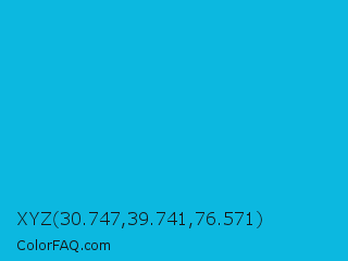 XYZ 30.747,39.741,76.571 Color is a normal cyan color and the nearest color is Cyan Process #00b7eb. Hex code #0cb8e0 and RGB value is rgb(12,184,224). In RGB color space, this color is composed of 5% red, 72% green, 88% blue, In CMYK color space, this color is composed of 95% cyan, 18% magenta, 0% yellow , 12% black , In HSL color space, this color has a hue angle of 191° , 90% saturation and 46% lightness.