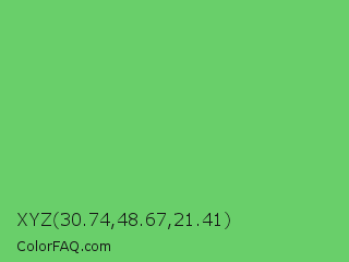 XYZ 30.74,48.67,21.41 Color is a light green color and the nearest color is Mantis #74c365. Hex code #69cf6a and RGB value is rgb(105,207,106). In RGB color space, this color is composed of 41% red, 81% green, 42% blue, In CMYK color space, this color is composed of 49% cyan, 0% magenta, 49% yellow , 19% black , In HSL color space, this color has a hue angle of 121° , 52% saturation and 61% lightness.