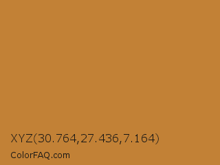 XYZ 30.764,27.436,7.164 Color is a normal orange color and the nearest color is Bronze #cd7f32. Hex code #c28136 and RGB value is rgb(194,129,54). In RGB color space, this color is composed of 76% red, 51% green, 21% blue, In CMYK color space, this color is composed of 0% cyan, 34% magenta, 72% yellow , 24% black , In HSL color space, this color has a hue angle of 32° , 56% saturation and 49% lightness.