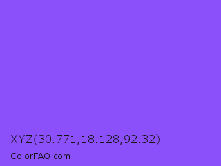 XYZ 30.771,18.128,92.32 Color is a light violet color and the nearest color is Navy Purple #9457eb. Hex code #8b50fa and RGB value is rgb(139,80,250). In RGB color space, this color is composed of 55% red, 31% green, 98% blue, In CMYK color space, this color is composed of 44% cyan, 68% magenta, 0% yellow , 2% black , In HSL color space, this color has a hue angle of 261° , 94% saturation and 65% lightness.