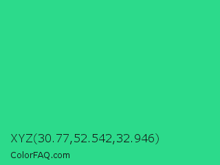 XYZ 30.77,52.542,32.946 Color is a normal green color and the nearest color is Shamrock #33cc99. Hex code #2cda8b and RGB value is rgb(44,218,139). In RGB color space, this color is composed of 17% red, 85% green, 55% blue, In CMYK color space, this color is composed of 80% cyan, 0% magenta, 36% yellow , 15% black , In HSL color space, this color has a hue angle of 153° , 70% saturation and 51% lightness.