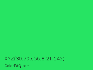 XYZ 30.795,56.8,21.145 Color is a normal green color and the nearest color is UFO Green #3cd070. Hex code #26e463 and RGB value is rgb(38,228,99). In RGB color space, this color is composed of 15% red, 89% green, 39% blue, In CMYK color space, this color is composed of 83% cyan, 0% magenta, 57% yellow , 11% black , In HSL color space, this color has a hue angle of 139° , 78% saturation and 52% lightness.
