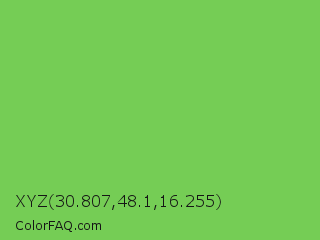 XYZ 30.807,48.1,16.255 Color is a normal green color and the nearest color is Mantis #74c365. Hex code #75cd55 and RGB value is rgb(117,205,85). In RGB color space, this color is composed of 46% red, 80% green, 33% blue, In CMYK color space, this color is composed of 43% cyan, 0% magenta, 59% yellow , 20% black , In HSL color space, this color has a hue angle of 104° , 55% saturation and 57% lightness.