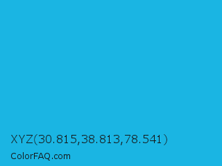 XYZ 30.815,38.813,78.541 Color is a normal blue color and the nearest color is Battery Charged Blue #1dacd6. Hex code #1ab5e3 and RGB value is rgb(26,181,227). In RGB color space, this color is composed of 10% red, 71% green, 89% blue, In CMYK color space, this color is composed of 89% cyan, 20% magenta, 0% yellow , 11% black , In HSL color space, this color has a hue angle of 194° , 79% saturation and 50% lightness.