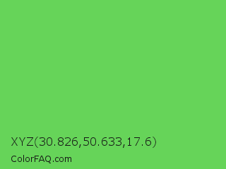 XYZ 30.826,50.633,17.6 Color is a normal green color and the nearest color is Mantis #74c365. Hex code #66d459 and RGB value is rgb(102,212,89). In RGB color space, this color is composed of 40% red, 83% green, 35% blue, In CMYK color space, this color is composed of 52% cyan, 0% magenta, 58% yellow , 17% black , In HSL color space, this color has a hue angle of 114° , 59% saturation and 59% lightness.