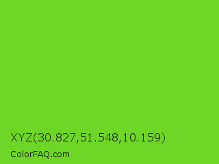 XYZ 30.827,51.548,10.159 Color is a normal green color and the nearest color is Lima #76bd17. Hex code #6ed626 and RGB value is rgb(110,214,38). In RGB color space, this color is composed of 43% red, 84% green, 15% blue, In CMYK color space, this color is composed of 49% cyan, 0% magenta, 82% yellow , 16% black , In HSL color space, this color has a hue angle of 95° , 70% saturation and 49% lightness.