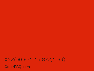 XYZ 30.835,16.872,1.89 Color is a normal red color and the nearest color is Maximum Red #d92121. Hex code #de2509 and RGB value is rgb(222,37,9). In RGB color space, this color is composed of 87% red, 15% green, 4% blue, In CMYK color space, this color is composed of 0% cyan, 83% magenta, 96% yellow , 13% black , In HSL color space, this color has a hue angle of 8° , 92% saturation and 45% lightness.