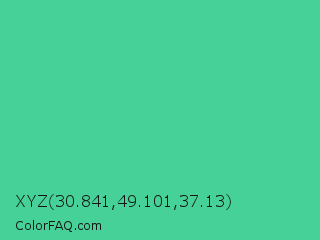 XYZ 30.841,49.101,37.13 Color is a normal green color and the nearest color is Eucalyptus #44d7a8. Hex code #45d197 and RGB value is rgb(69,209,151). In RGB color space, this color is composed of 27% red, 82% green, 59% blue, In CMYK color space, this color is composed of 67% cyan, 0% magenta, 28% yellow , 18% black , In HSL color space, this color has a hue angle of 155° , 60% saturation and 55% lightness.
