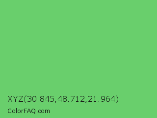 XYZ 30.845,48.712,21.964 Color is a light green color and the nearest color is Mantis #74c365. Hex code #69cf6c and RGB value is rgb(105,207,108). In RGB color space, this color is composed of 41% red, 81% green, 42% blue, In CMYK color space, this color is composed of 49% cyan, 0% magenta, 48% yellow , 19% black , In HSL color space, this color has a hue angle of 122° , 52% saturation and 61% lightness.