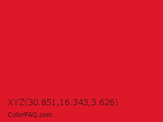XYZ 30.851,16.343,3.626 Color is a normal red color and the nearest color is Maximum Red #d92121. Hex code #de1829 and RGB value is rgb(222,24,41). In RGB color space, this color is composed of 87% red, 9% green, 16% blue, In CMYK color space, this color is composed of 0% cyan, 89% magenta, 82% yellow , 13% black , In HSL color space, this color has a hue angle of 355° , 80% saturation and 48% lightness.