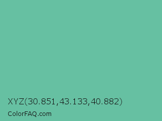 XYZ 30.851,43.133,40.882 Color is a normal green color and the nearest color is Tradewind #5fb3ac. Hex code #66c0a2 and RGB value is rgb(102,192,162). In RGB color space, this color is composed of 40% red, 75% green, 64% blue, In CMYK color space, this color is composed of 47% cyan, 0% magenta, 16% yellow , 25% black , In HSL color space, this color has a hue angle of 160° , 42% saturation and 58% lightness.