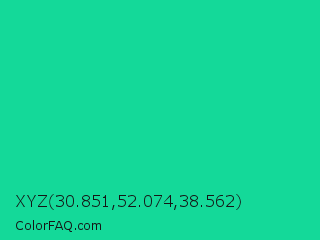 XYZ 30.851,52.074,38.562 Color is a normal green color and the nearest color is Caribbean Green #00cc99. Hex code #14d999 and RGB value is rgb(20,217,153). In RGB color space, this color is composed of 8% red, 85% green, 60% blue, In CMYK color space, this color is composed of 91% cyan, 0% magenta, 29% yellow , 15% black , In HSL color space, this color has a hue angle of 161° , 83% saturation and 46% lightness.