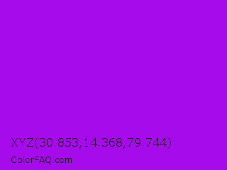 XYZ 30.853,14.368,79.744 Color is a normal purple color and the nearest color is Vivid Mulberry #b80ce3. Hex code #a60ceb and RGB value is rgb(166,12,235). In RGB color space, this color is composed of 65% red, 5% green, 92% blue, In CMYK color space, this color is composed of 29% cyan, 95% magenta, 0% yellow , 8% black , In HSL color space, this color has a hue angle of 281° , 90% saturation and 48% lightness.