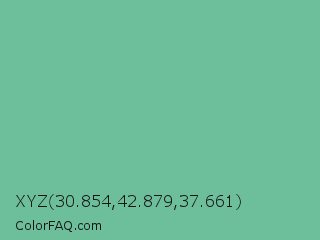 XYZ 30.854,42.879,37.661 Color is a normal green color and the nearest color is Silver Tree #66b58f. Hex code #6dbf9b and RGB value is rgb(109,191,155). In RGB color space, this color is composed of 43% red, 75% green, 61% blue, In CMYK color space, this color is composed of 43% cyan, 0% magenta, 19% yellow , 25% black , In HSL color space, this color has a hue angle of 154° , 39% saturation and 59% lightness.